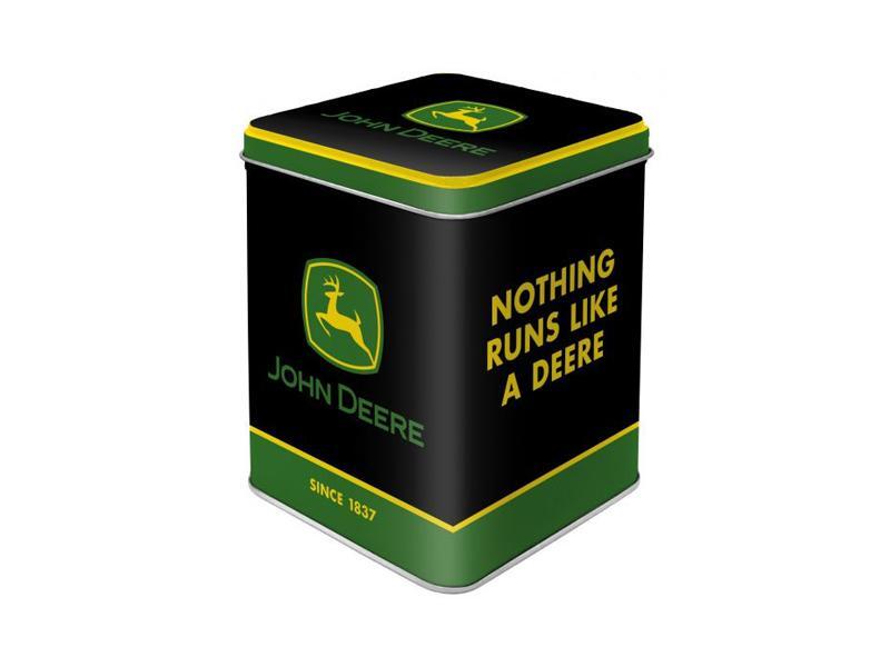 Commentaire : Boîte à thé « John Deere - Logo noir ». Format 7,50 x 7,50 x 9,50 cm (longueur/largeur/hauteur), capacité 100 g de thé en vrac, tôle d’acier, finition mate, embossé sur plusieurs couches, sans danger pour les aliments.