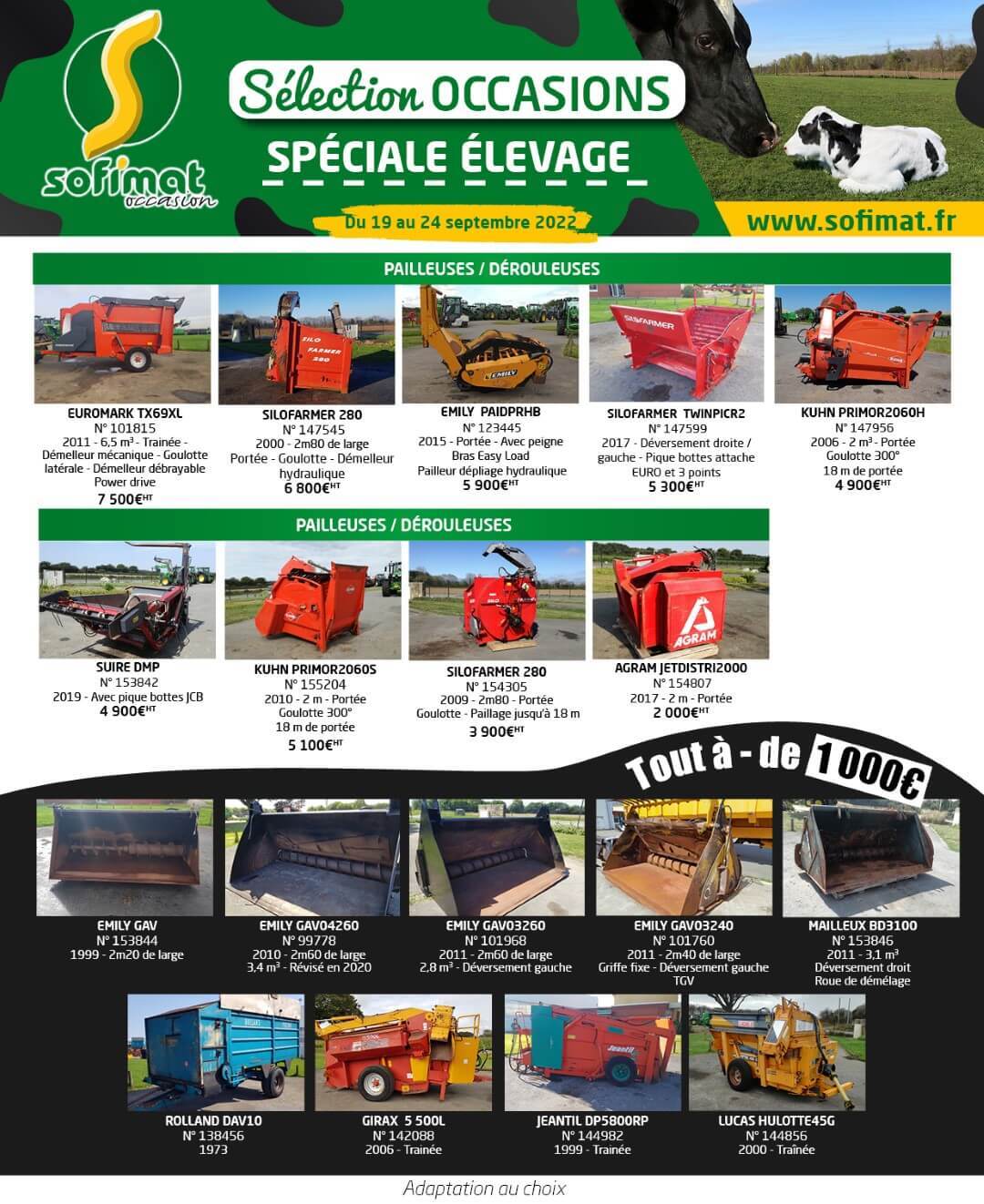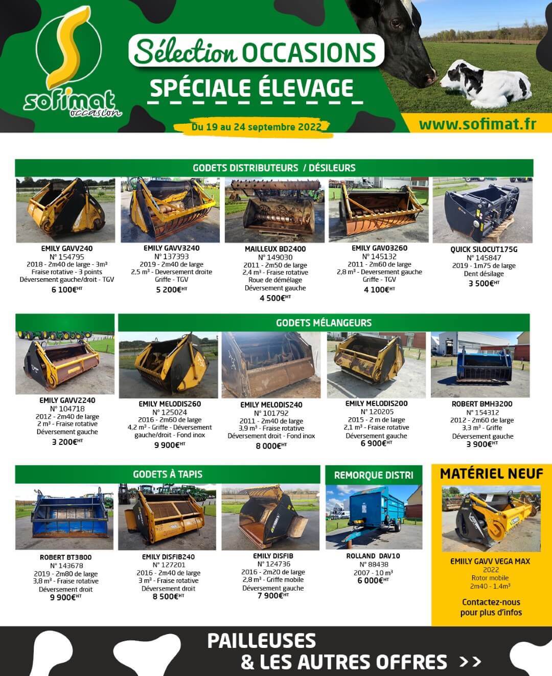 La semaine du matériel d' élevage chez Sofimat - Un grand nombre de matériels en état neuf et occasion à saisir du 19 au 24 septembre 2022 : Godet distributeur | Désileur | Mélangeur | Godet à tapis | Godet à vis | Remorque distributrice | Pailleuse | Dérouleuse etc